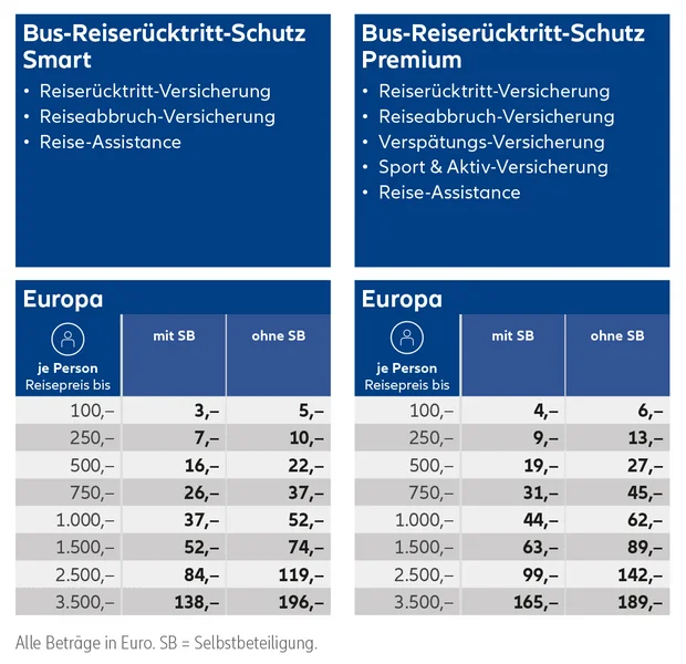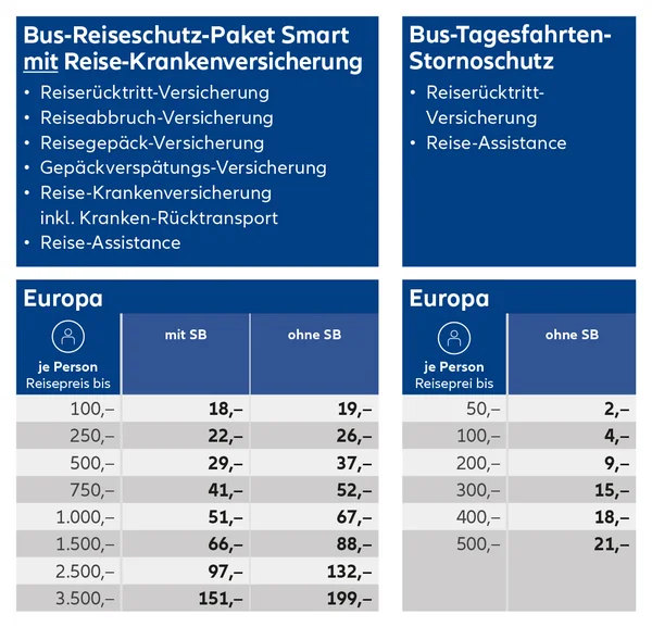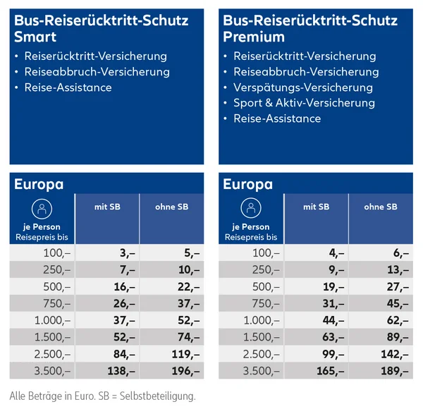 Bus-Reiserücktritt-Schutz Smart & Premium und Bus-Reiseschutz-Paket Smart: Maximal sind 3.500,– € je Person möglich.